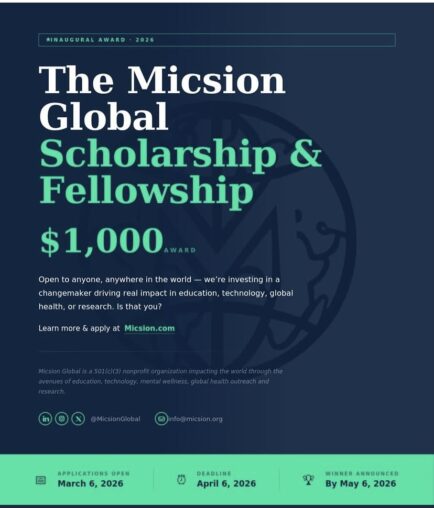 Applications are now open for the Micsion Global Scholarship & Fellowship 2026, a global opportunity designed to support individuals who are creating meaningful impact in their communities through innovation, research, education, and social action.