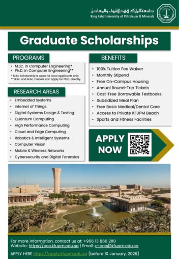 The Computer Engineering Department at King Fahd University of Petroleum & Minerals (KFUPM) invites motivated and passionate candidates to apply for our PhD, Direct PhD, and MS (self-sponsored) programs.