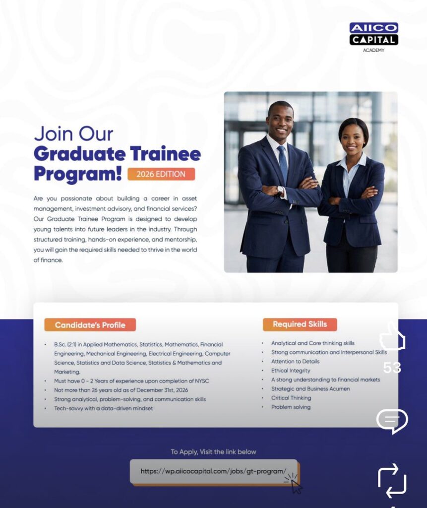 2026 AIICO Capital Graduate Trainee ProgramAre you passionate about building a career in asset management, investment advisory, and financial services? This Graduate Trainee Program is designed to develop young talents into future leaders in the…