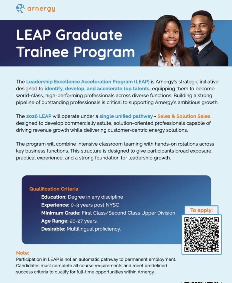 2026 Arnergy Solar Leap Graduate Trainee ProgramARNERGY is a distributed utility technology company that leverage Internet of Things (IoT) to deploy affordable, reliable distributed solar energy solutions to rural and urban consumers and SMEs across Nigeria…