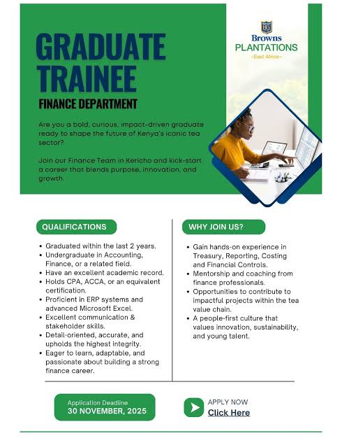 2025 Browns Plantations Finance Graduate Trainee – KerichoAre you a bold, curious, impact-driven graduate ready to shape the future of Kenya’s iconic tea sector? Join our Finance team in Kericho and kick-start a career that blends purpose, innovation, and growth.…