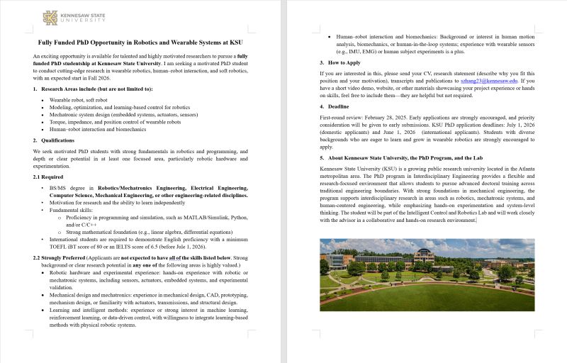 Fully Funded PhD Position – Wearable RoboticsFully Funded PhD Position – Wearable Robotics 🎊 I’m looking for a PhD student to join my research group at Kennesaw State University, with a planned start in Fall 2026. In the lab, we work on wearable and…