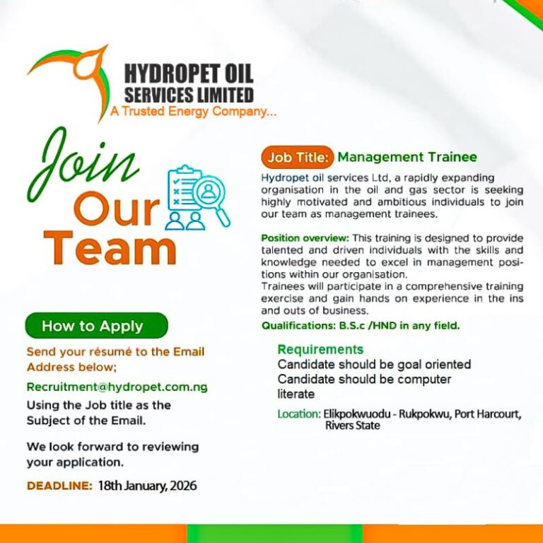 Graduate Management Trainee Program at Hydropet Oil Services Limited 2026Graduate Management Trainee Program 2026 (Oil & Gas) — Hydropet Oil Services Limited Employment Type: Full-time (Graduate Trainee)Application Deadline: 18th January, 2026 About Hydropet Oil Services Limited…