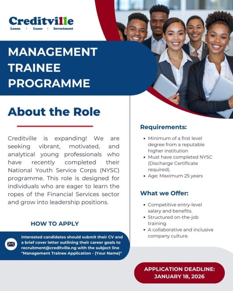 2026 Creditville Management Trainee ProgrammeCreditville Limited is an asset management company and a private lending institution registered in Nigeria. Creditville target customer base includes individuals on paid employment and SMEs in Nigeria.…